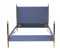 Letto a una piazza con montanti in ottone scanalato, puntali in vetro, testata, pediera e sponde imbottite e rivestite in tessuto blu (difetti)