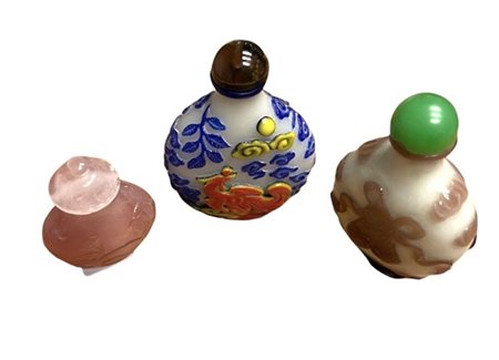 Lotto di tre snuff bottles di cui due in vetro con decoro a rilievo e una in quarzo rosa