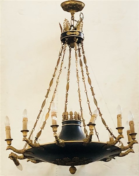 Lampadario "Impero" a tredici luci in bronzo e metallo brunito e dorato. Decorato a fregi e motivi vegetali in rilievo. Braccia a forma di testa di rapaci (d cm 90) (difetti)