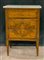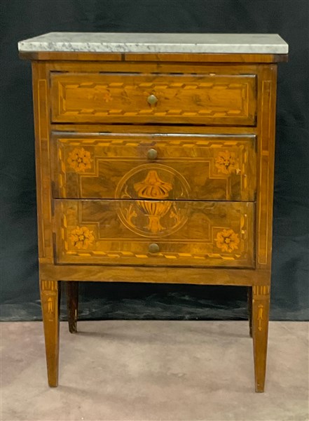 Comodino in legno intarsiato e filettato. Tre cassetti sul fronte, gambe ad obelisco rovesciato. Piano in marmo non pertinente. Secolo XVIII (difetti)