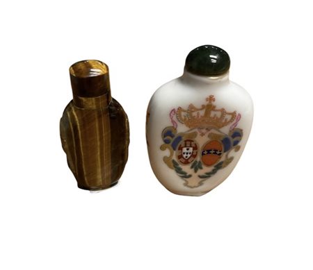 Lotto di due snuff bottles di cui una in pietra dura con anse incise a testa ferina e l'altra in porcellana bianca decorata da stemma coronato