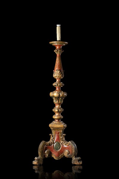 Torciera tripode in legno intagliato, laccato e dorato a volute e foglie. Secolo XVIII (h. cm 186) (difetti e restauri)