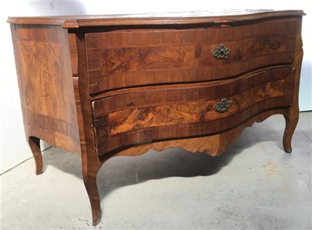 Antico comó a due cassetti lastronato e filettato, fronte e fianchi mossi. (cm 162x88x76) (difetti e mancanze)