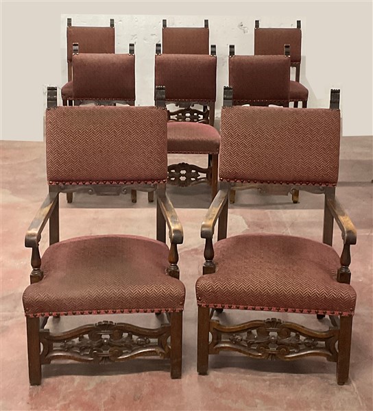 Lotto composto da due poltrone e sei sedie in legno intagliato con fascia traforata. Rivestite in tessuto borchiato (difetti)