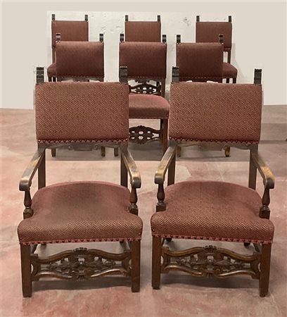 Lotto composto da due poltrone e sei sedie in legno intagliato con fascia trafo