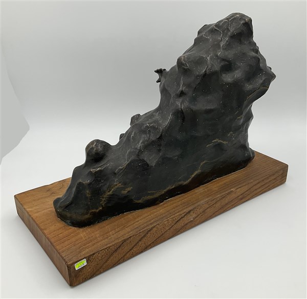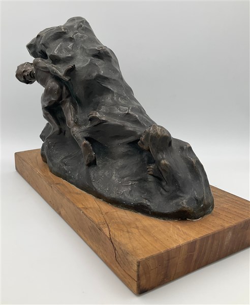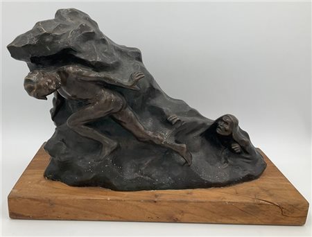 Firma indecifrata "Scena tragica" scultura in bronzo (cm 28x40) poggiante su base in legno. Firmata e datata 1923 in basso a destra