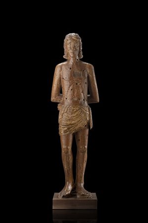 Central Italian artist, 15th-century "Saint Sebastian" all-round wooden sculpture (h. cm 136) (defects and losses)