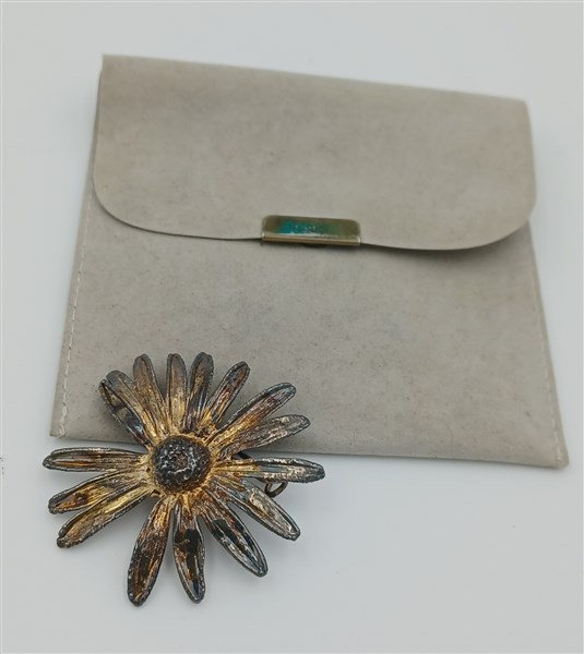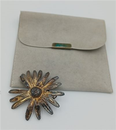 Spilla a fiore in argento e metallo, g. 7,53 circa, diam. cm 4,8 circa. Con custodia grigia.