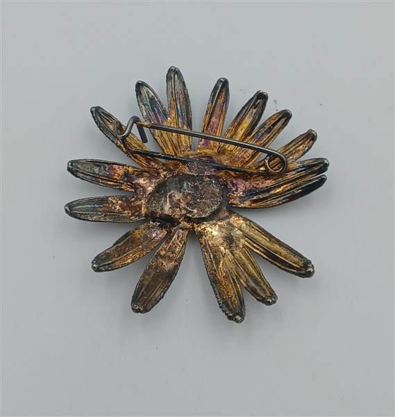 Spilla a fiore in argento e metallo, g. 7,53 circa, diam. cm 4,8 circa. Con cus