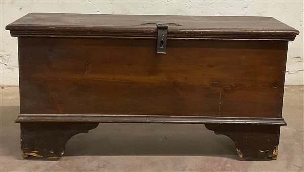 Piccola cassapanca in legno con piedi a mensola e divisori interni (cm 97x48x33) (difetti e mancanze)