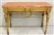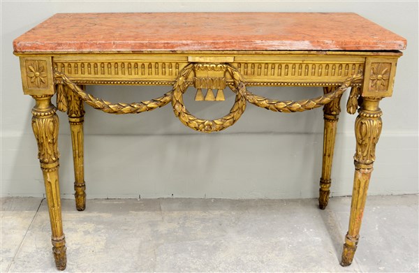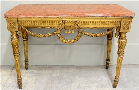 Tavolo da parete in legno dorato, gambe rastremate con attacchi e puntali a foglie d'acanto, fronte e fianchi decorati con festoni a foglie di quercia, piano in marmo rosso, fine sec. XVIII (cm 126x89x63) (difetti e restauri)