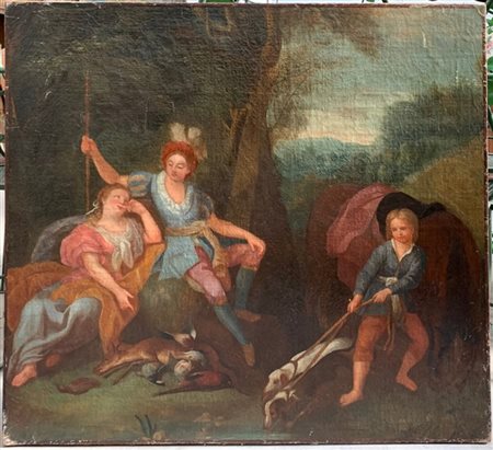 Ignoto "Scena galante" antico dipinto ad olio su tela applicata su compensato (cm 87x93,5)