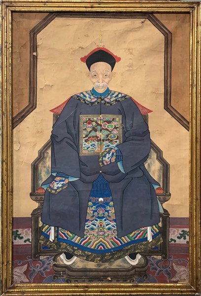 Ritratto di dignitario cinese, tecnica mista su carta applicata su tela (cm 97x63), in cornice. Cina, fine secolo XIX (danni)