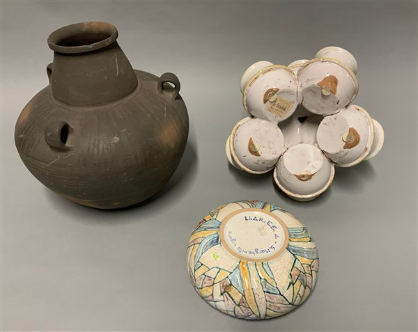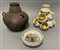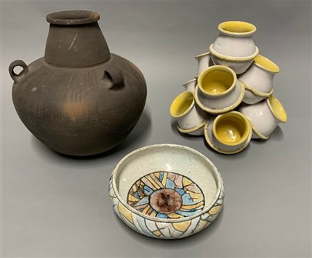 Manifatture differenti, lotto composto da una fioriera e un centrotavola in ceramica policroma, ed un vaso a tre anse in terracotta (h max cm 30) (difetti)