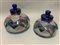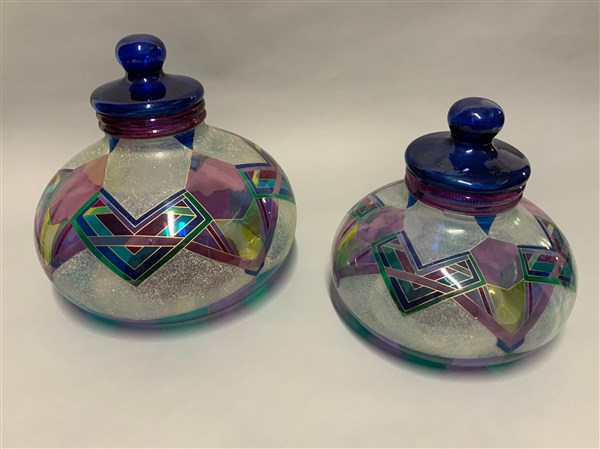 Lotto di due contenitori con coperchi in vetro dipinti a motivi geometrici (h m