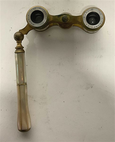 Binocolo da teatro in metallo dorato e madreperla, con manico. Marcato La Filotermica Milano, inizio sec. XX (difetti)