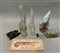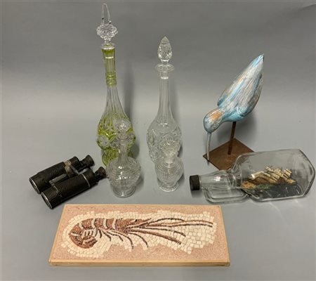 Lotto composto da quattro bottiglie con tappi, un modello di veliero in bottiglia, un uccello in legno dipinto, un pannello con fregio in mosaico e un binocolo (difetti)