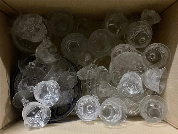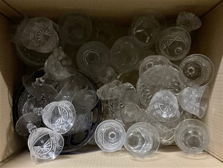 Manifatture diverse, cartone contenente una parte di servizio di bicchieri, un servizio da macedonia, una ciotola e un piccolo centrotavola, in cristallo molato (difetti)