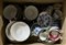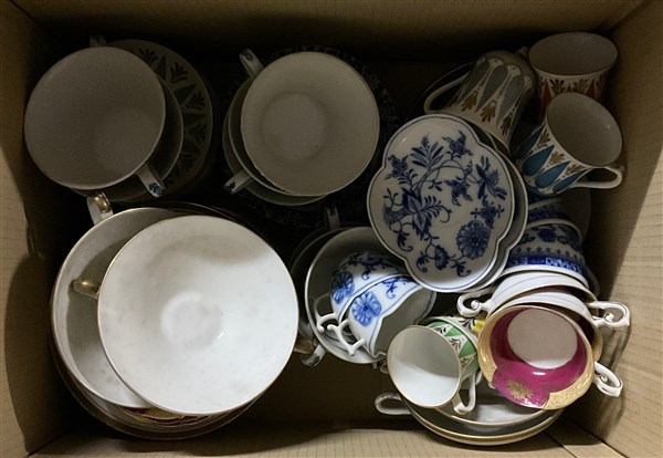 Manifatture diverse, cartone contenente parti di servizi da thé e caffè in ceramica con decori diversi (difetti)