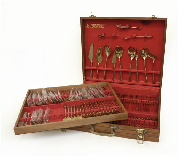 Parte di servizio di posate in metallo dorato, contenute un custodia originale
