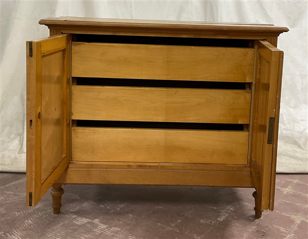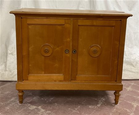 Cassettiera in legno chiaro a due ante, piedi torniti (difetti)