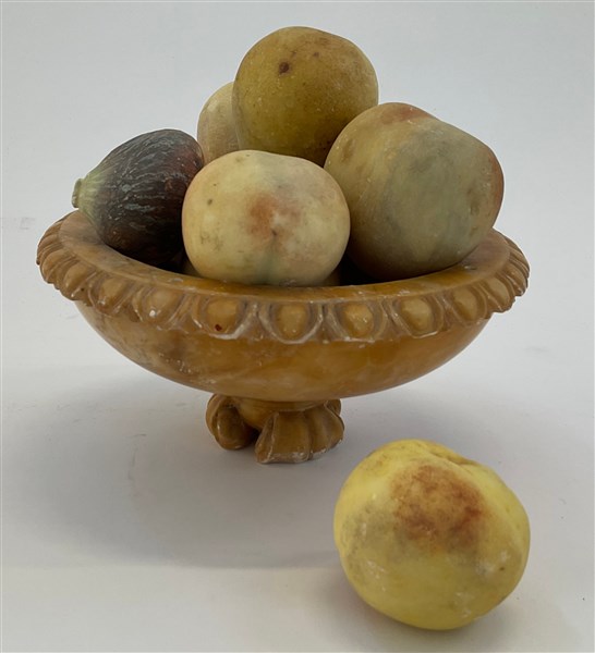 Cratere in marmo contenente frutti in alabastro dipinto ad effetto realistico (d cm 21) (difetti)