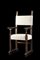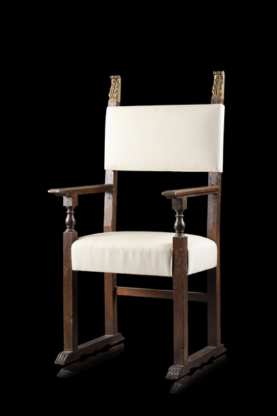 Seggiolone in legno con braccioli e schienale di forma squadrata, piedi intagli