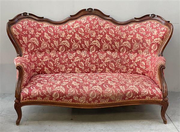 Divano a tre posti con schienale, montanti e gambe sagomate, rivestimento in tessuto a fiori e frutta (difetti)