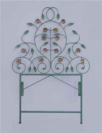Testata da letto di forma mossa in ferro battuto verde decorata con in fiori in metallo dorato (cm 99x147) (difetti)