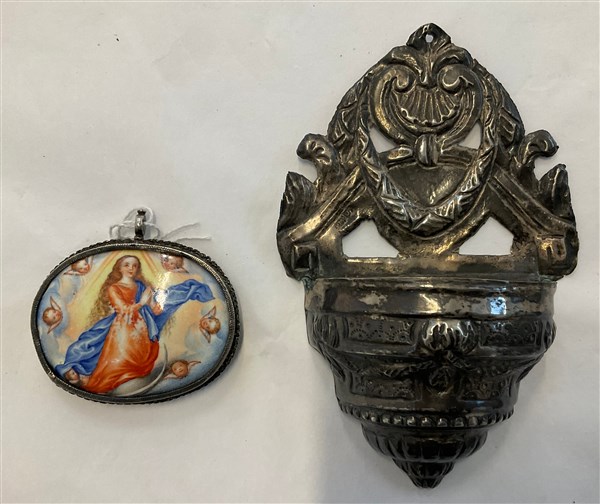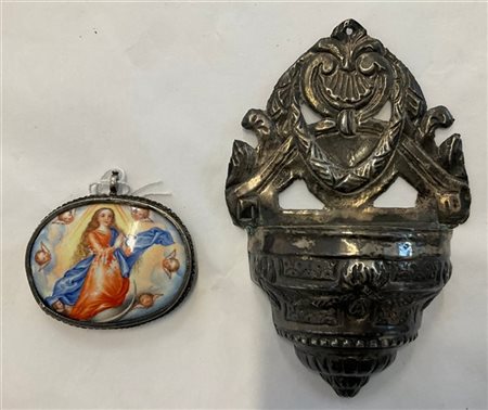Lotto composto da un acquasantiera in argento sbalzato (cm 10x15) e un porta reliquie del secolo XIX in argento con placca in ceramica smaltata raffigurante l'Immacolata (cm 6,5x1,2x6) (difetti)