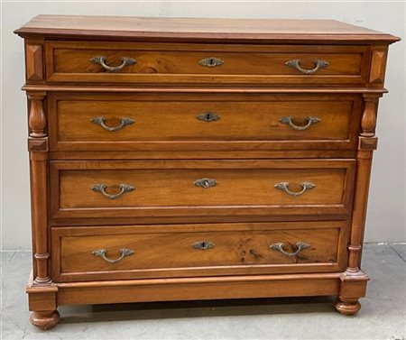 Comò a tre cassetti riquadrati più uno piccolo sottopiano, montanti a mezza colonna tornita, piedi a cipolla (cm 116x160x55) (difetti)