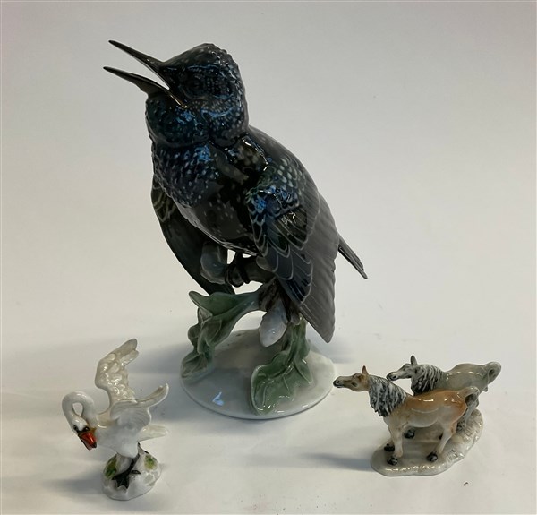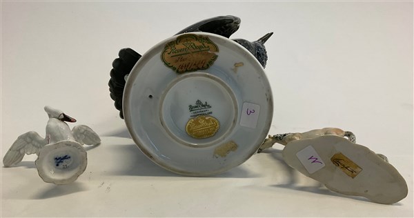Lotto composto da una scultura in porcellana policroma raffiguranti animali: un uccello su ramo marcato Rosenthal (h cm 20), due puledri firmati Cacciapuoti e un cigno della manifattura di Meissen (h cm 6 e cm 8) (difetti e restauri)