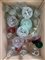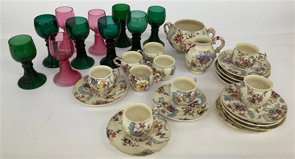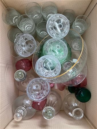 Lotto di cinque cartoni contenenti bicchieri e calici in vetro di diverso uso, decoro e manifattura uniti a due brocche e sei cremiere, un servizio da caffè composto da zuccheriera, lattiera, nove tazzine e undici piattini in porcellana, un cestino traforato e un centrotavola in metallo (difetti e mancanze)