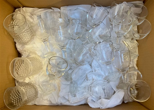 Lotto di cinque cartoni contenenti bicchieri e calici in vetro di diverso uso,