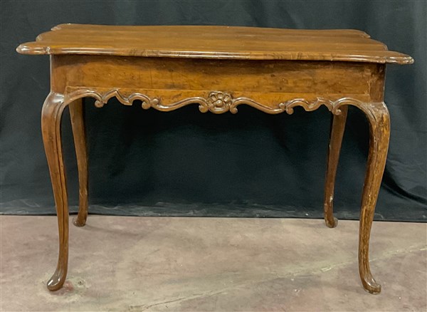 Tavolo da centro in noce con fasce intagliate a volute e fiori, gambe e piano di forma mossa. Secolo XVIII (cm 120x80x70) (difetti e restauri)
