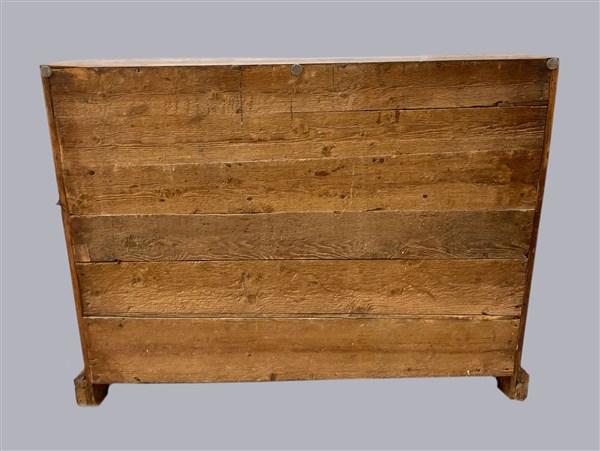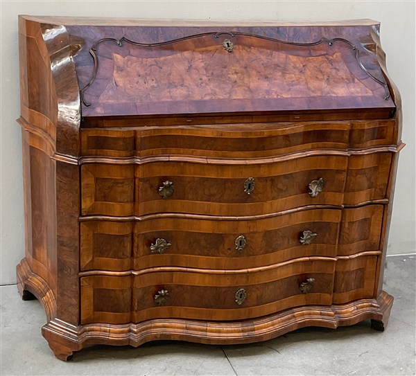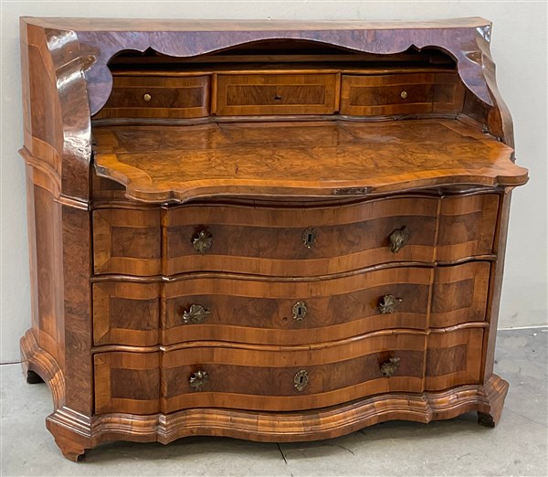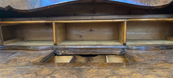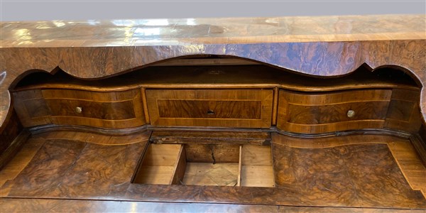 Antica ribalta di forma sagomata lastronata in noce, radica e piuma di noce e filettata in legno chiaro. Anta con profilo decorato da sagomette celante tre cassettini in linea, vano a giorno e segreto. Fronte di linea spezzata a tre cassetti, piedi sagomati, (cm 140x108x63) (difetti e restauri)