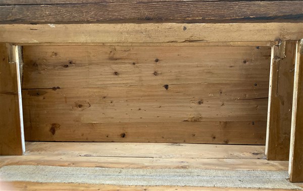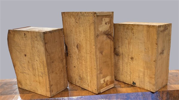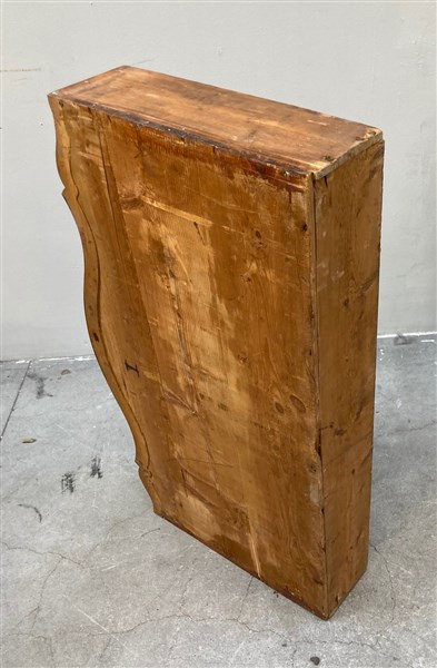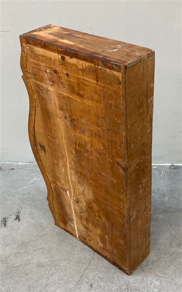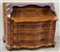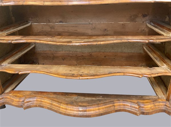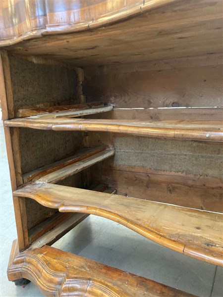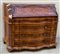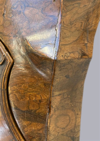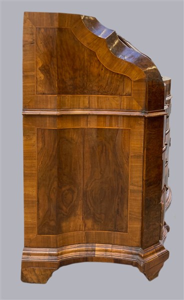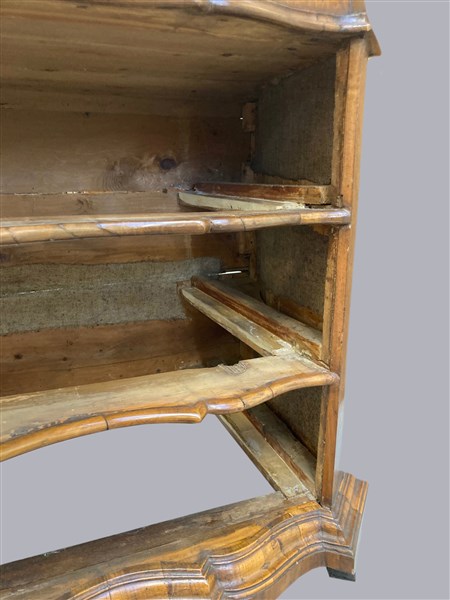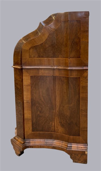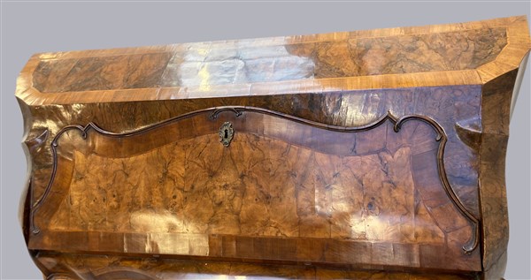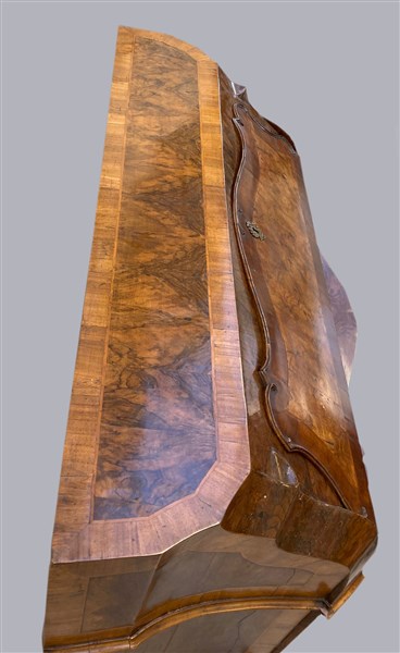 Antica ribalta di forma sagomata lastronata in noce, radica e piuma di noce e f