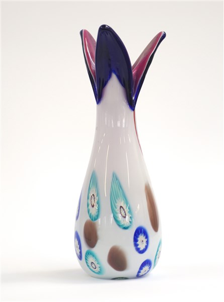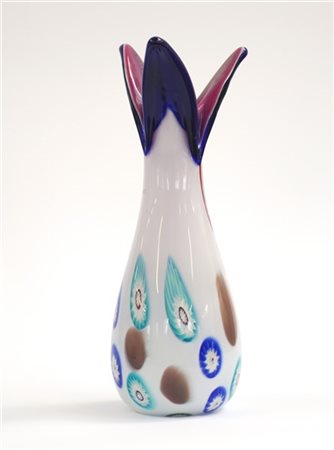 Vaso in vetro incamiciato lattimo con inclusione di murrine policrome. Italia, anni '70. (h cm 40)
