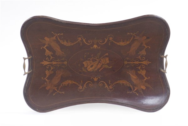 Vassoio biansato di forma sagomata intarsiato in legni vari a strumenti musicali, angeli, cornucopie e motivi vegetali (cm 63x42) (difetti)