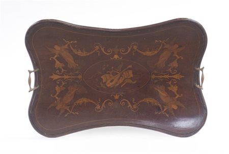 Vassoio biansato di forma sagomata intarsiato in legni vari a strumenti musical