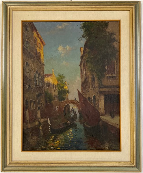 Firma indecifrata "Canale veneziano" olio su tela (cm 70x50) Firmato in basso a destra. In cornice