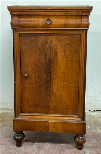 Comoda lastronata a un'anta e un cassetto, piedi torniti (cm 43x79x36) (difetti)