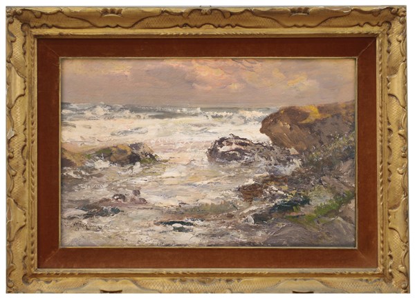 Ignoto del XX Secolo "Marina con scogliera" olio su cartone (cm 28x43) reca iscrizione in basso a sinistra, in cornice