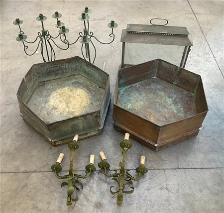 Lotto composto da un portacandele, due fioriere in ottone, una coppia di candelieri a cinque fiamme e una coppia di applique (difetti)