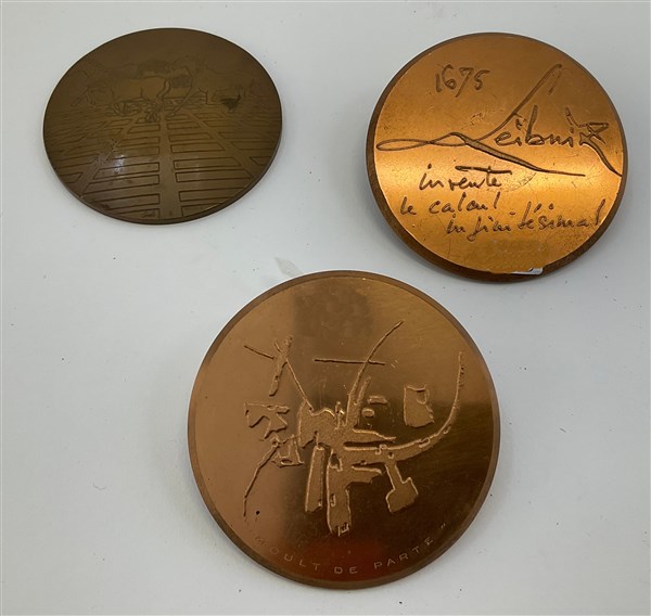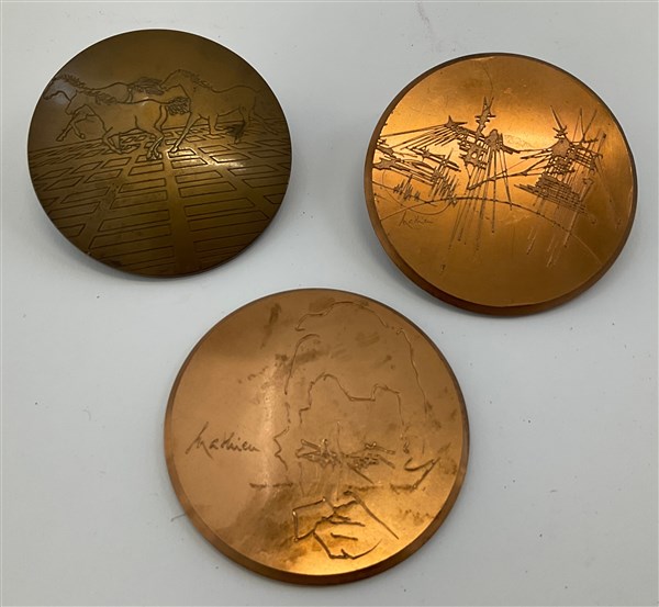 Lotto composto da tre medaglie in metallo (diam. cm 8), due con riproduzioni di opere di Mathieu e una di Ceroli