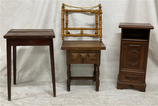 Lotto composto da un comodino, un tavolino da lavoro e uno d'appoggio in legno,
