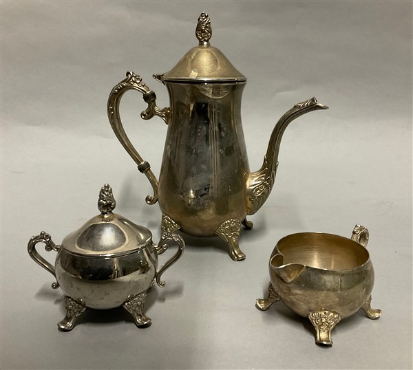 Servizio da ceffè in metallo argentatocomposto da una caffettiera, una lattiera ed una zuccherieracon manici sagomati e decori in rilievo (difetti)