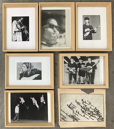 Cartone contenente sette fotografie vintage, alcune raffiguranti cantanti e musicisti tra cui i Beatles e Jagger