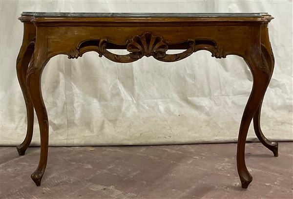 Tavolo da parete di forma mossa, fascia traforata a volute e valve di conchiglia. Piano in marmo. Secolo XVIII (137x81x60) (difetti)