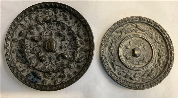 Manifattura orientale, lotto di due antichi specchi in bronzo in stile Tang (d